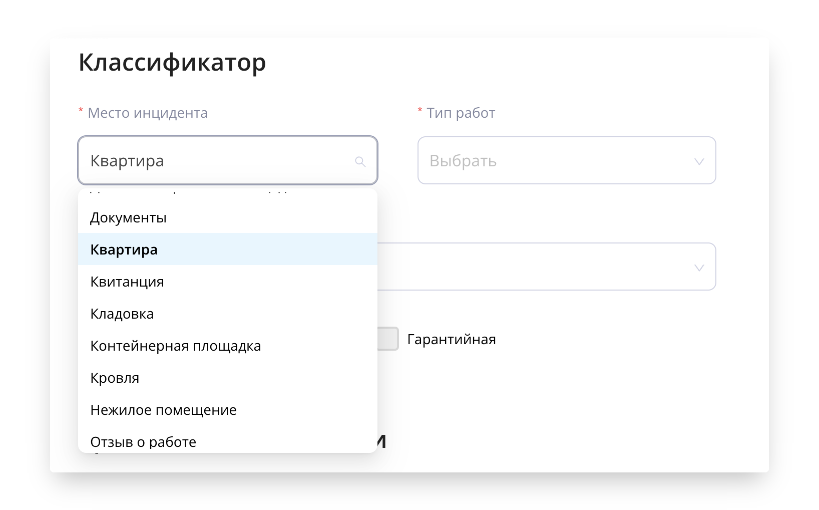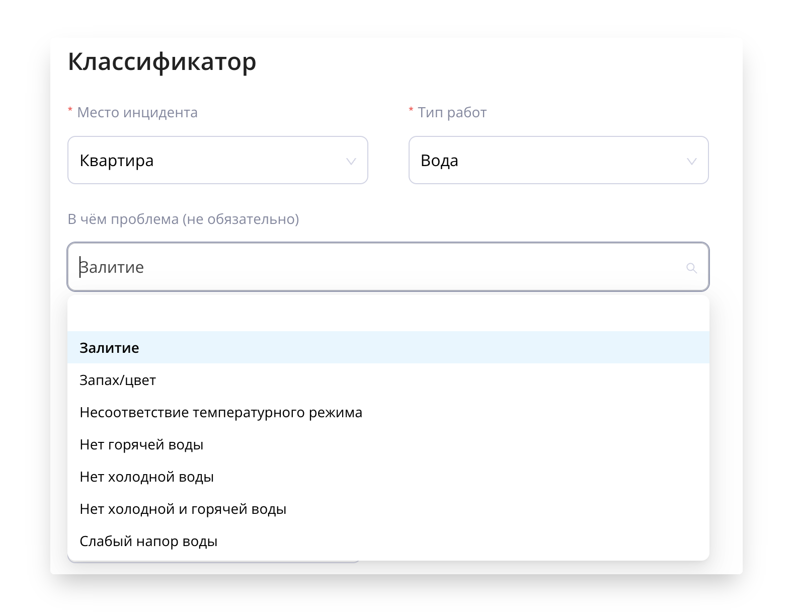 Таким образом, если квартиру залили соседи, вам надо в «месте инцидента» выбрать «квартира», в типе работ — «вода» и в описании проблемы указать залитие или «жителя заливают соседи сверху». Или, например, людям, которые не живут в вашем доме, стал известен код от подъезда, и теперь они с удовольствием ходят на крышу смотреть закат. Тогда в классификаторе заявки надо выбрать место инцидента — «безопасность», и тип работ — «домофон».