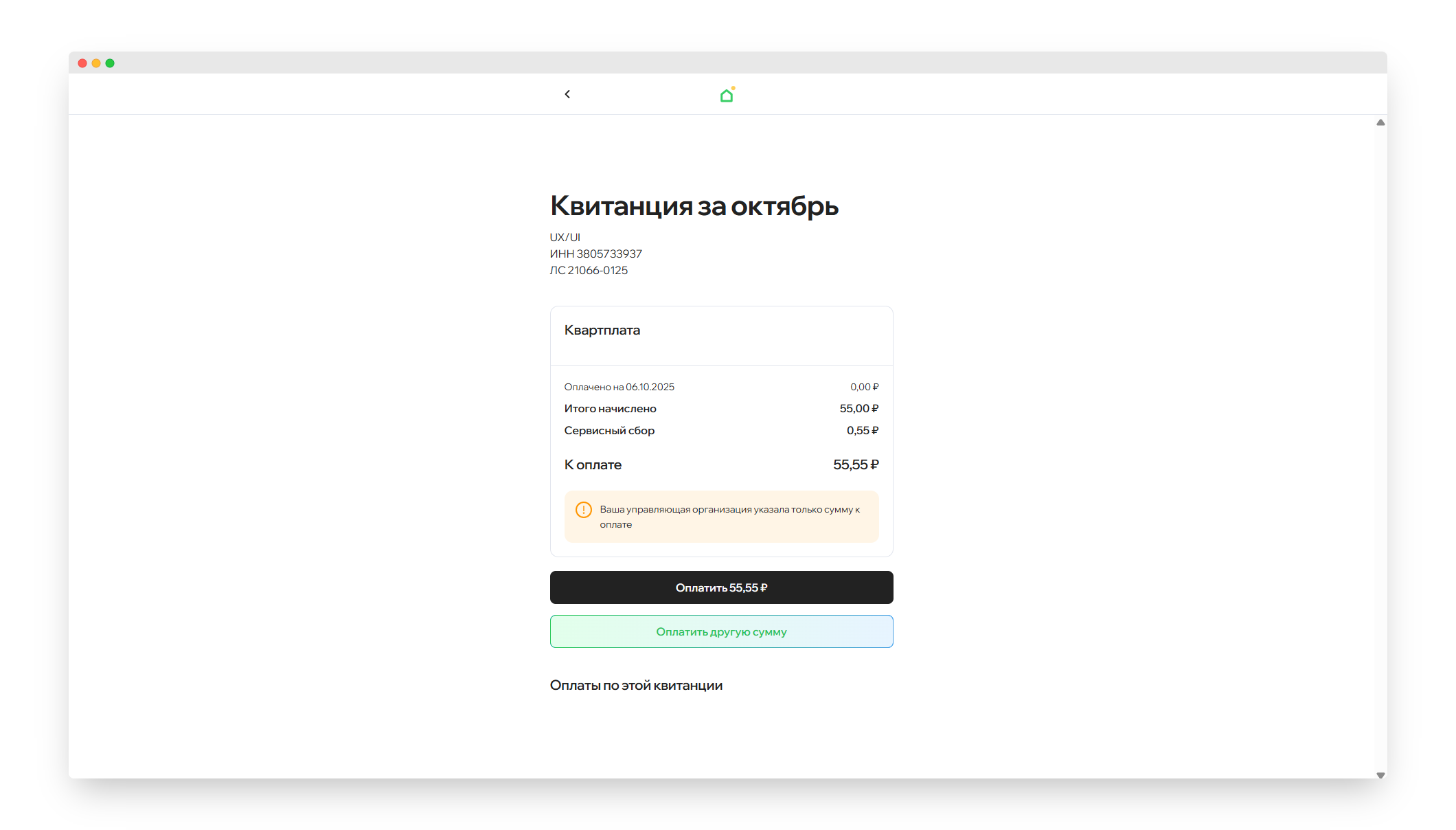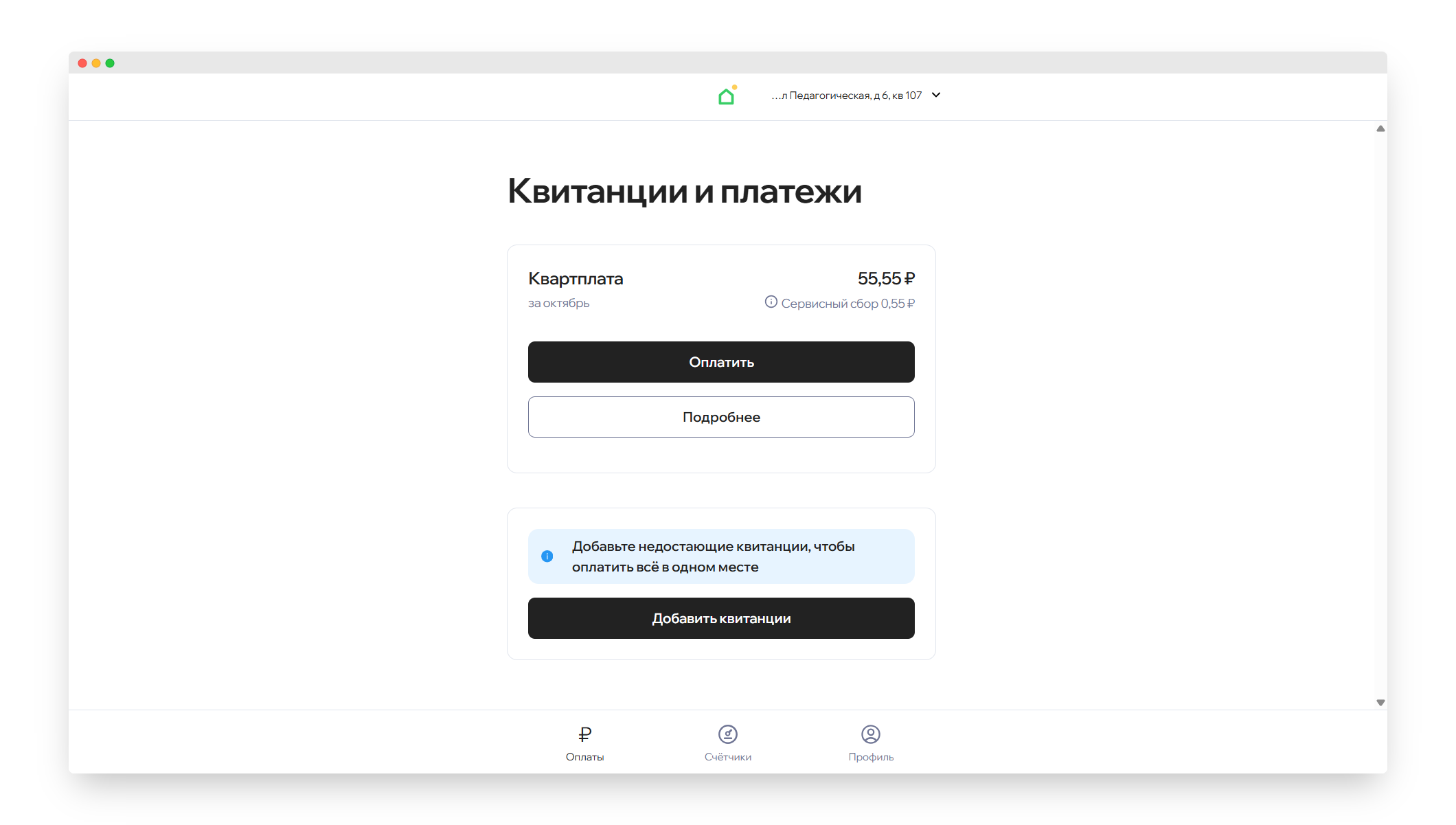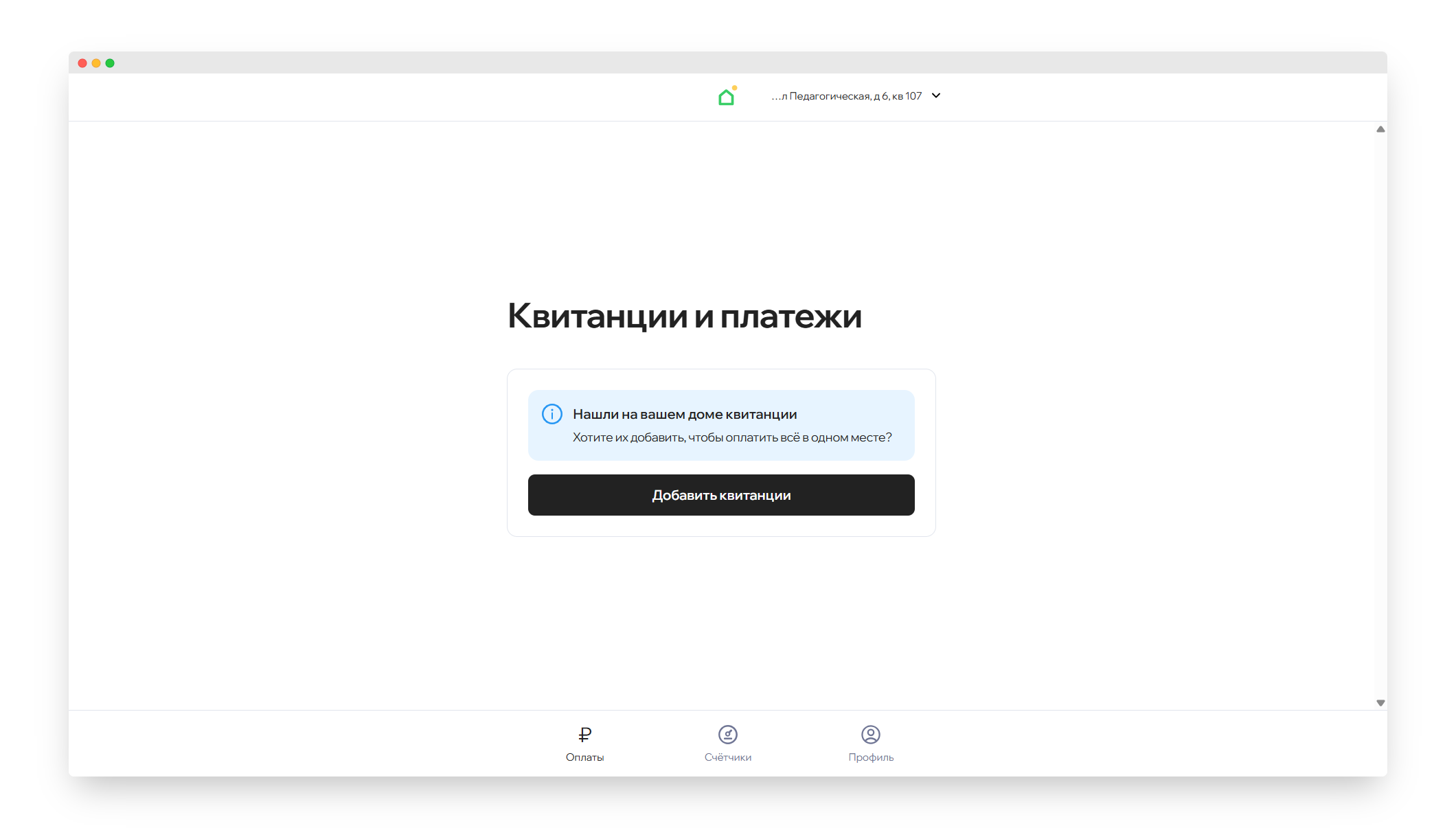 Актуальные квитанции доступны в разделе «Оплаты» сразу после регистрации и добавления первого адреса. Перейдите в раздел «Оплаты», чтобы увидеть квитанции от вашей управляющей компании.