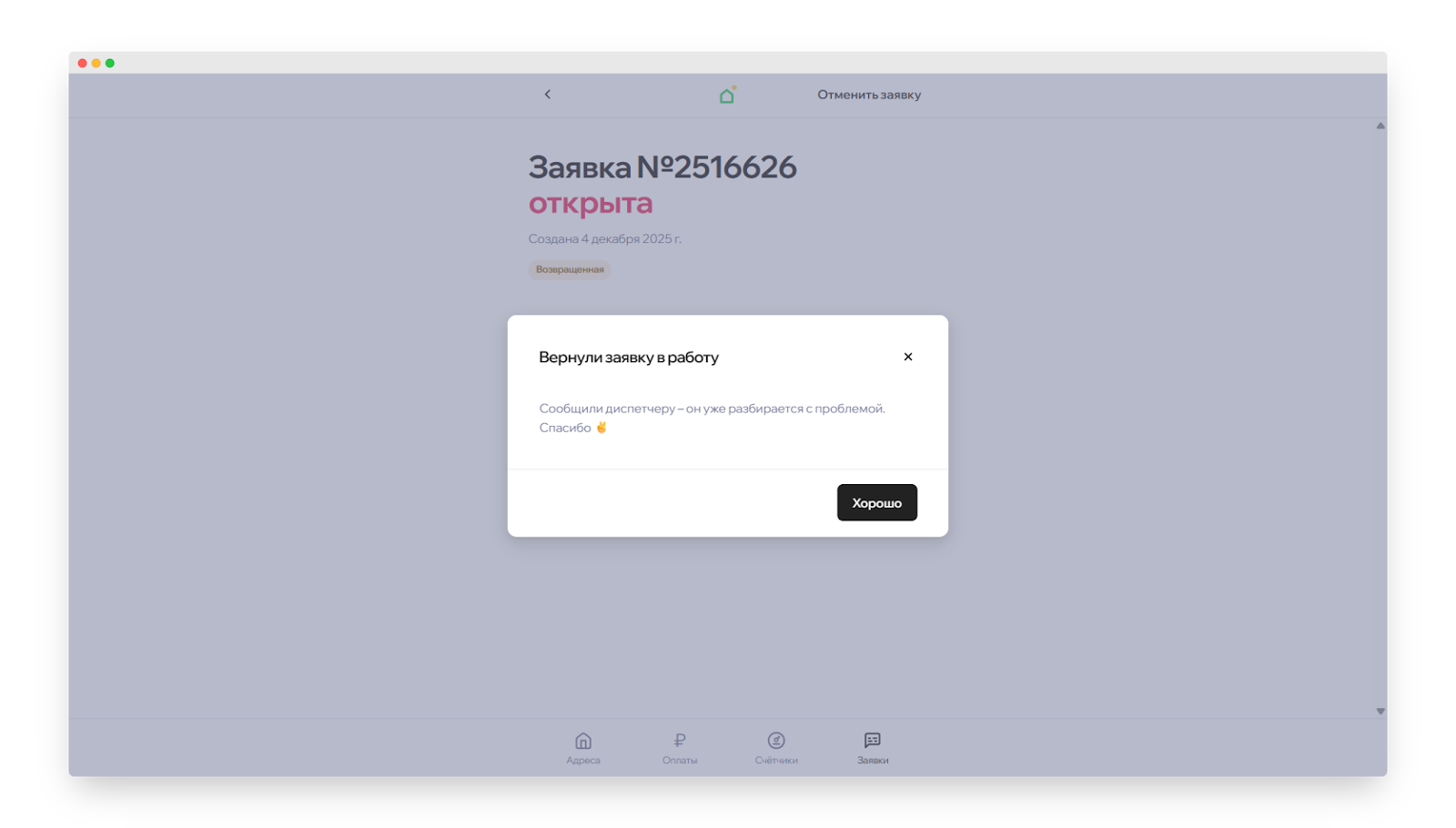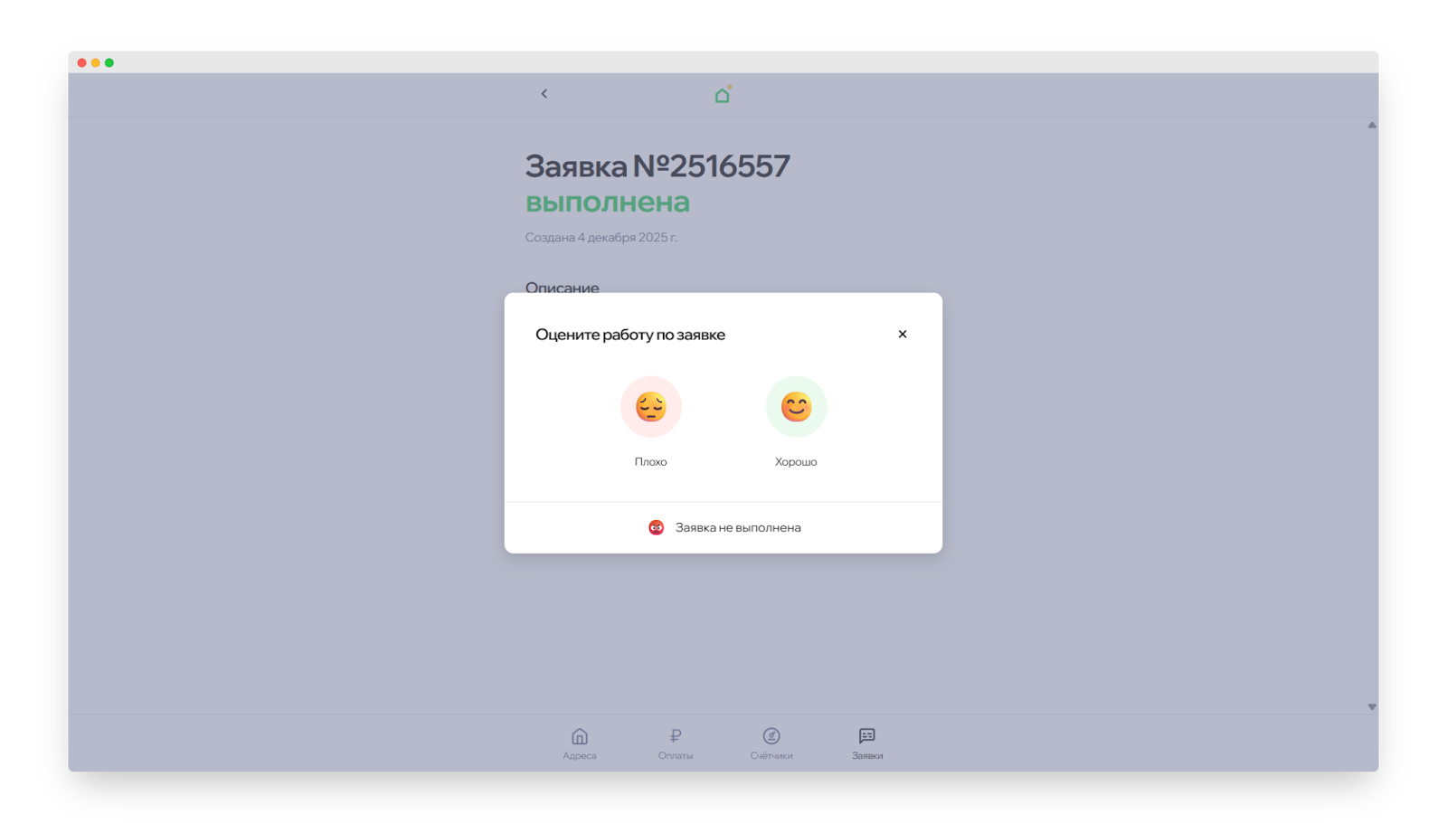 Если вы хотите вернуть выполненную заявку в работу, нажмите «Заявка не выполнена».