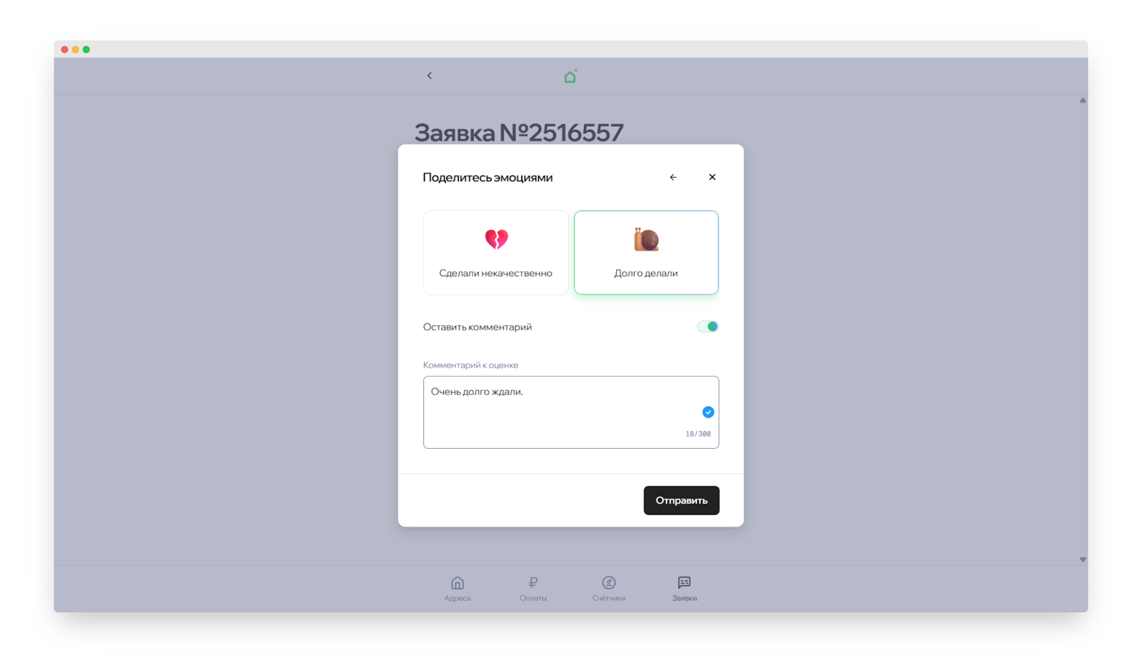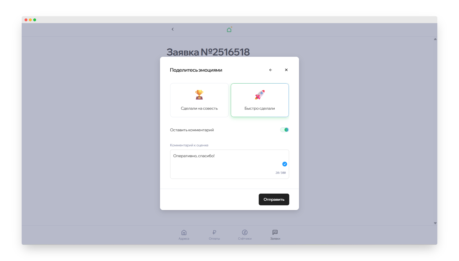 - Если работа выполнена хорошо, расскажите подробнее, что именно вам понравилось. Нажмите на переключатель «Оставить комментарий», напишите отзыв, а после нажмите «Отправить». Это поможет управляющей компании принимать верные решения в будущем.