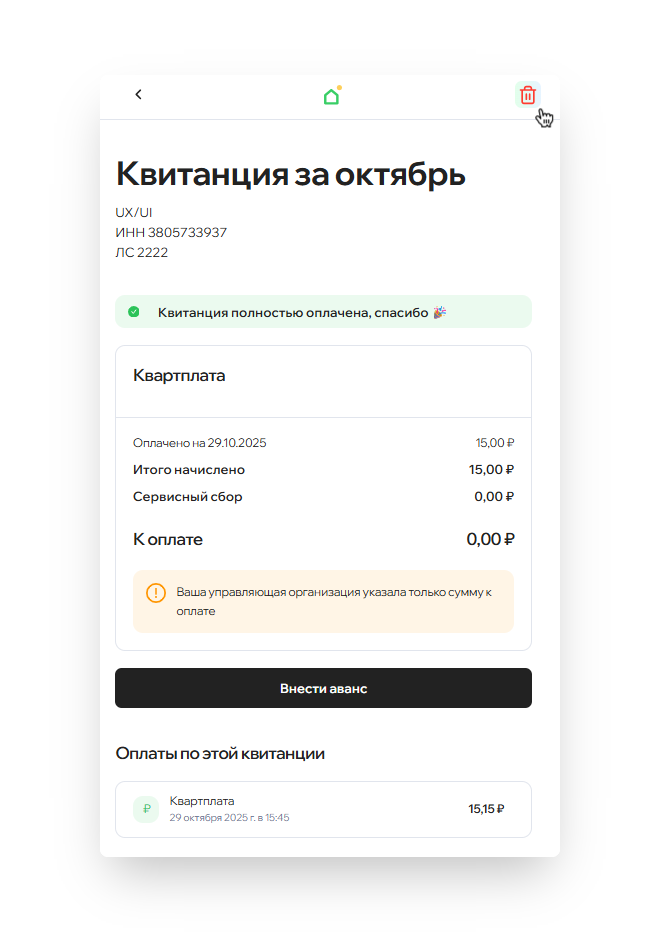 Пользователи теперь могут удалять ненужные квитанции в веб-версии мобильного приложения. Для этого нужно открыть квитанцию и нажать на значок корзины в правом верхнем углу.