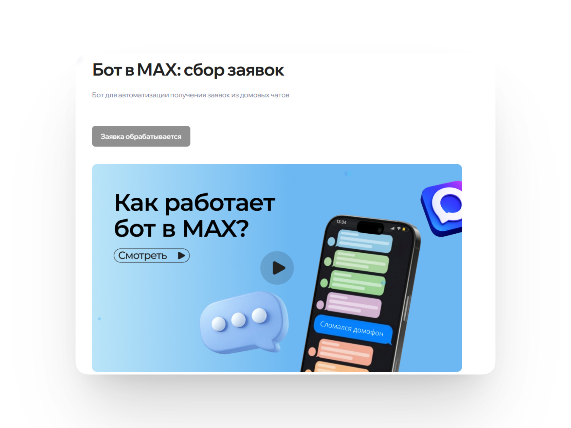 Бот поможет управляющим компаниям принимать обращения жителей из домовых чатов в MAX. Подробнее о том, как подключить бота, вы можете прочитать в статье «Заявки из домовых чатов в мессенджере MAX».
